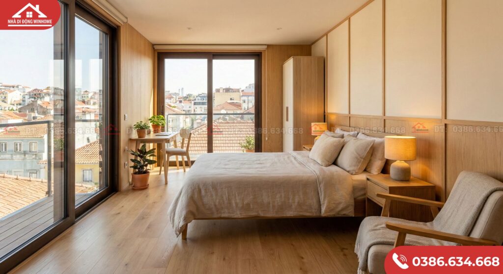 Nội thất phòng ngủ đẹp trong nhà lắp ghép trên sân thượng.
