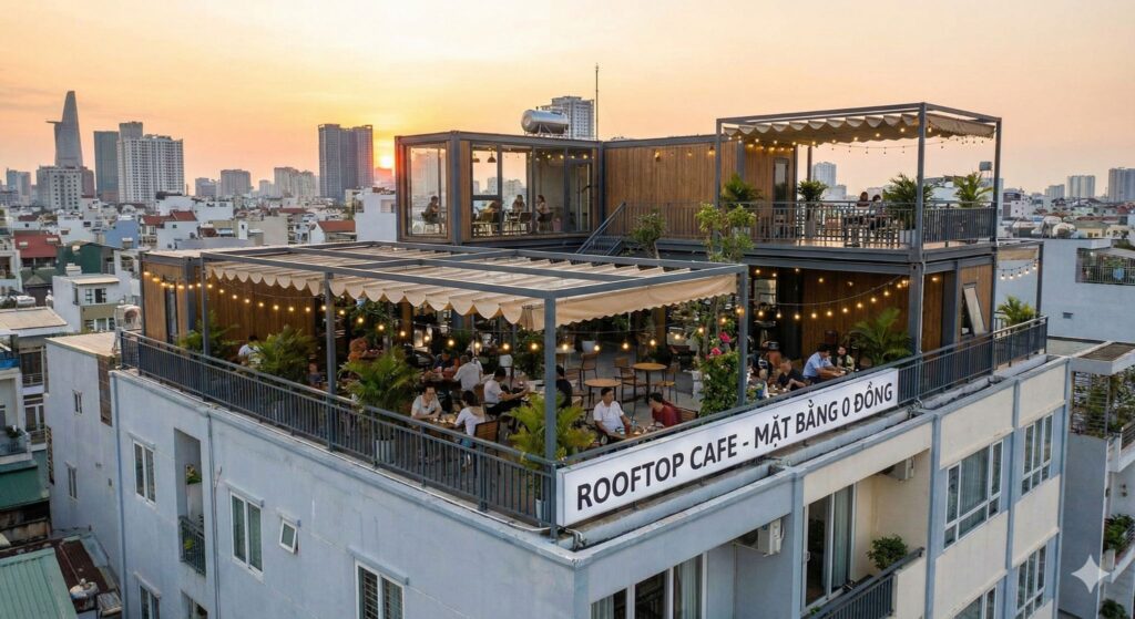 Đó chính là sân thượng bỏ trống hoặc khoảng sân vườn ít sử dụng. Tận dụng những không gian này để tạo ra mặt bằng kinh doanh 0 đồng đang là xu hướng thông minh nhất năm 2025. Kết hợp với mô hình cafe sân thượng (Rooftop Cafe) cực “chill”, bạn hoàn toàn có thể sở hữu một mô hình kinh doanh siêu lợi nhuận với rủi ro thấp nhất.