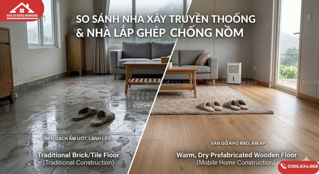 Tuy nhiên, với sự lên ngôi của kiến trúc hiện đại, có một giải pháp đang chứng minh hiệu quả tuyệt đối trước kiểu thời tiết khắc nghiệt này. Đó chính là nhà lắp ghép chống nồm. Hãy cùng tìm hiểu bí quyết giúp Nhà di động Winhome luôn giữ được sự khô ráo, thoáng mát bất chấp mùa nồm ẩm đỉnh điểm.