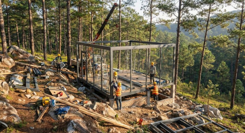 Nắm bắt xu hướng này, mô hình nhà lắp ghép homestay kiểu Bungalow Full Kính (toàn kính) đang trở thành “mỏ vàng” cho các nhà đầu tư nhờ công thức: Chi phí thấp + Thi công nhanh = Hoàn vốn thần tốc.