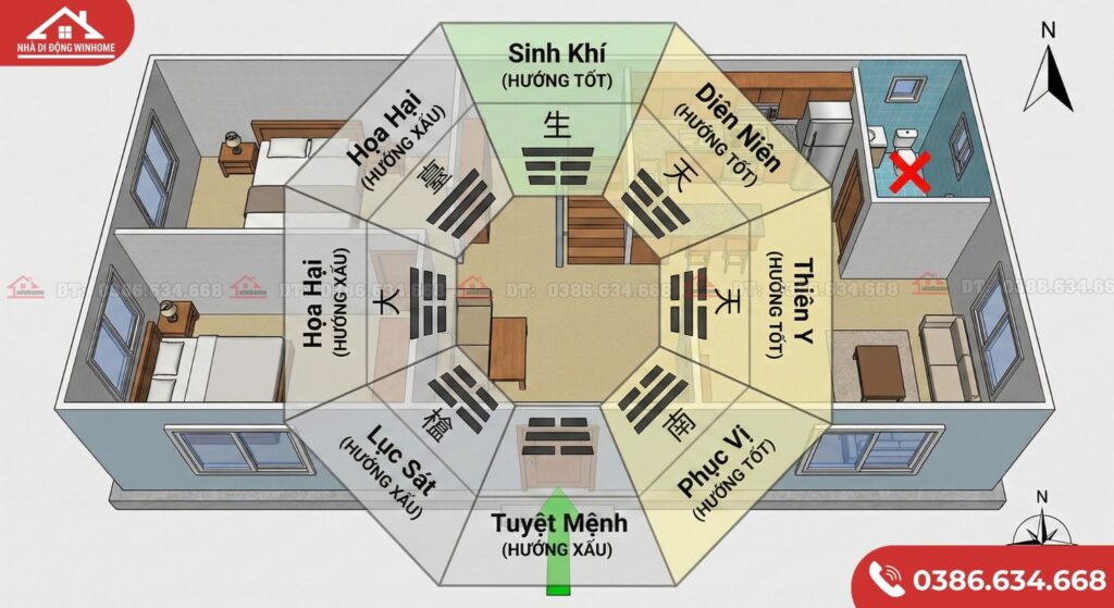 • Phòng vệ sinh: Luôn đặt ở các góc khuất, hướng xấu (Hung) để “tọa hung hướng cát”, trấn áp khí xấu.