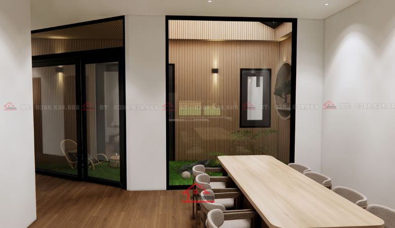 - Phòng khách rộng rãi: Thiết kế thoáng đãng, kết hợp với ô giếng trời tạo cảm giác gần gũi với thiên nhiên, giúp không gian phòng khách luôn sáng và thoáng.