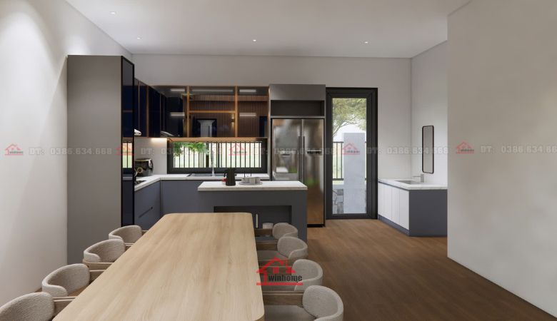 - Phòng bếp tiện nghi: Được bố trí đầy đủ trang thiết bị, kết nối thông minh với các không gian khác, giúp tối ưu hóa diện tích sử dụng.