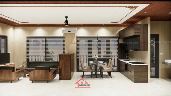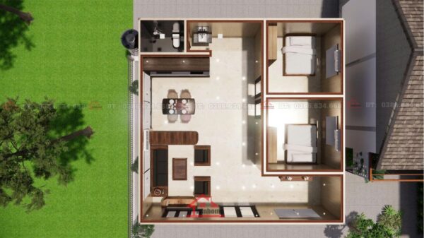- Công Năng Sử Dụng: – 1 phòng khách (tích hợp sofa và bàn trà, cửa kính lớn). – Phòng bếp (trang bị kệ bếp và bàn ăn 4-6 người). – 2 phòng ngủ (có cửa sổ và tủ âm tường). – 1 nhà vệ sinh (đầy đủ bồn rửa, bồn cầu và vòi sen).