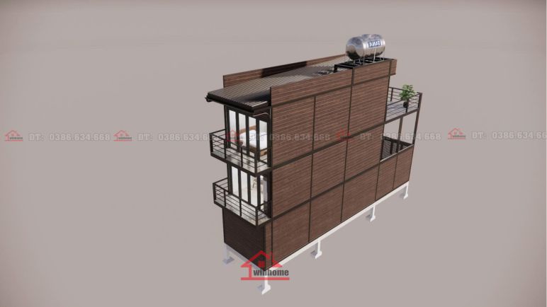 Nhà di động Winhome nổi bật với khả năng di chuyển dễ dàng đến mọi địa hình, từ đô thị đến vùng nông thôn hay khu nghỉ dưỡng. Thiết kế 3 tầng với cầu thang nội bộ chắc chắn, kết hợp ban công kính và sân thượng nhỏ, mang lại không gian thư giãn lý tưởng. Đây là giải pháp hoàn hảo cho homestay, văn phòng di động hoặc nhà ở gia đình nhỏ. Đặc biệt, nhà mặt phố Hà Nội với mặt tiền hẹp có thể tham khảo mẫu nhà này để tận dụng tối đa không gian, phù hợp với các khu vực đông đúc như phố cổ hoặc các tuyến phố thương mại.
