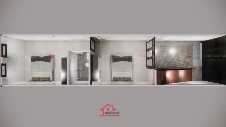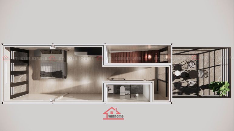 LƯU Ý: Nhà Di động Winhome đã hoàn thiện bao gồm toàn bộ Vách – Nền – Trần. Khách hàng cần chuẩn bị đầu chờ điện nước, bể phốt (hầm thoát WC) để kết nối với hệ thống ống chờ sẵn của cô ng trình.