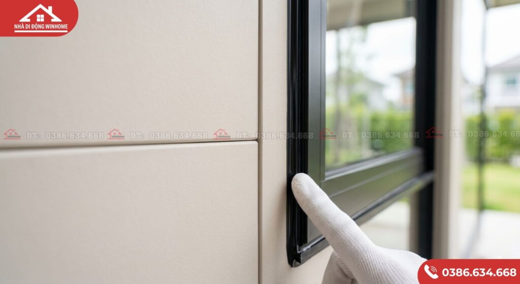 - Đường keo Silicone và gioăng chống thấm: Hãy kiểm tra kỹ các góc tường, vị trí tiếp giáp giữa vách và sàn, giữa vách và trần, hoặc quanh khung cửa sổ. Đường keo phải đi liền mạch, láng mịn, không bị đứt đoạn hay nổi bọt khí để đảm bảo nước mưa không thể thấm ngược vào trong.